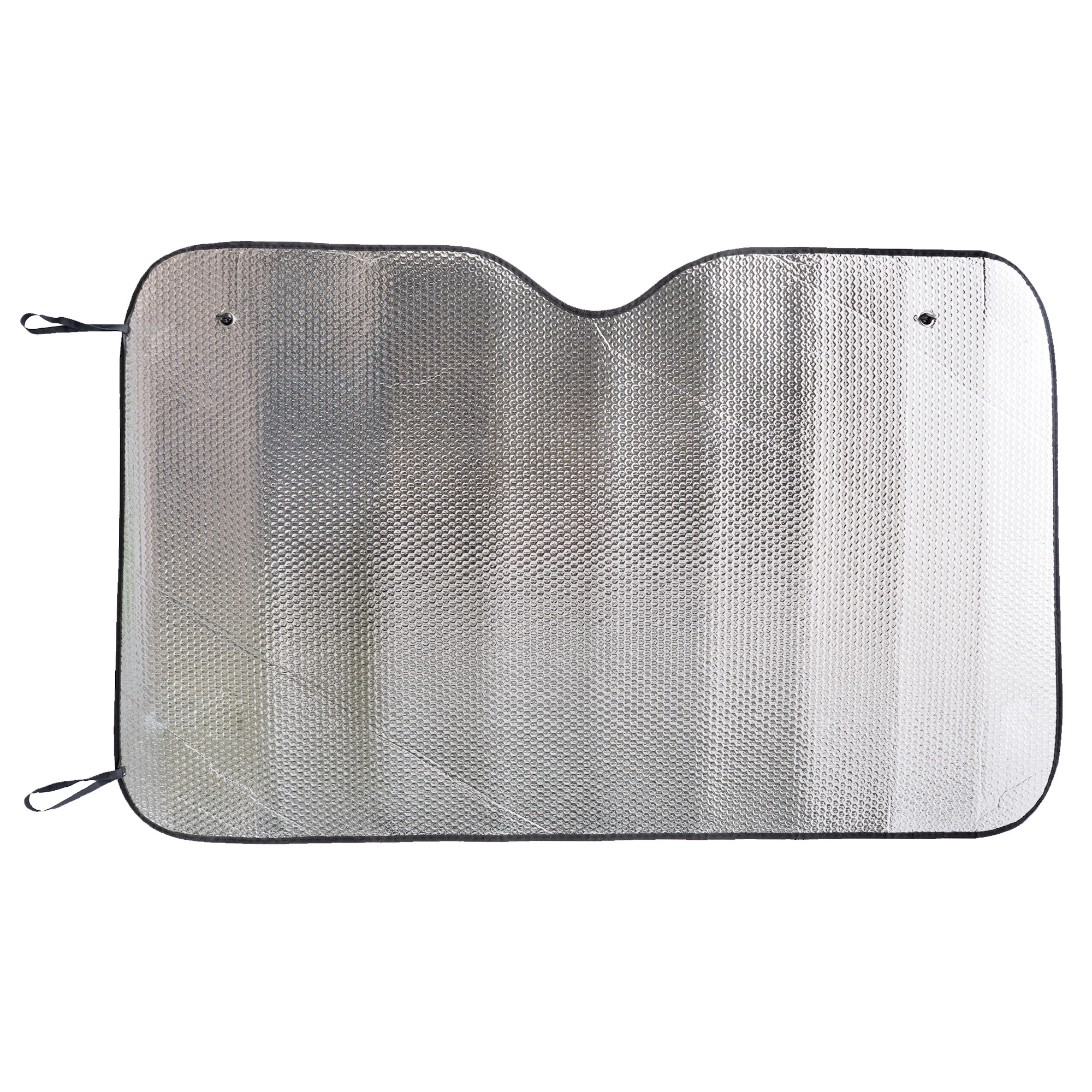 Parasol para coche de aluminio con burbuja doble cara y ribete. Incluye prácticas ventosas y gomas elásticas en color negro para su enrollado.