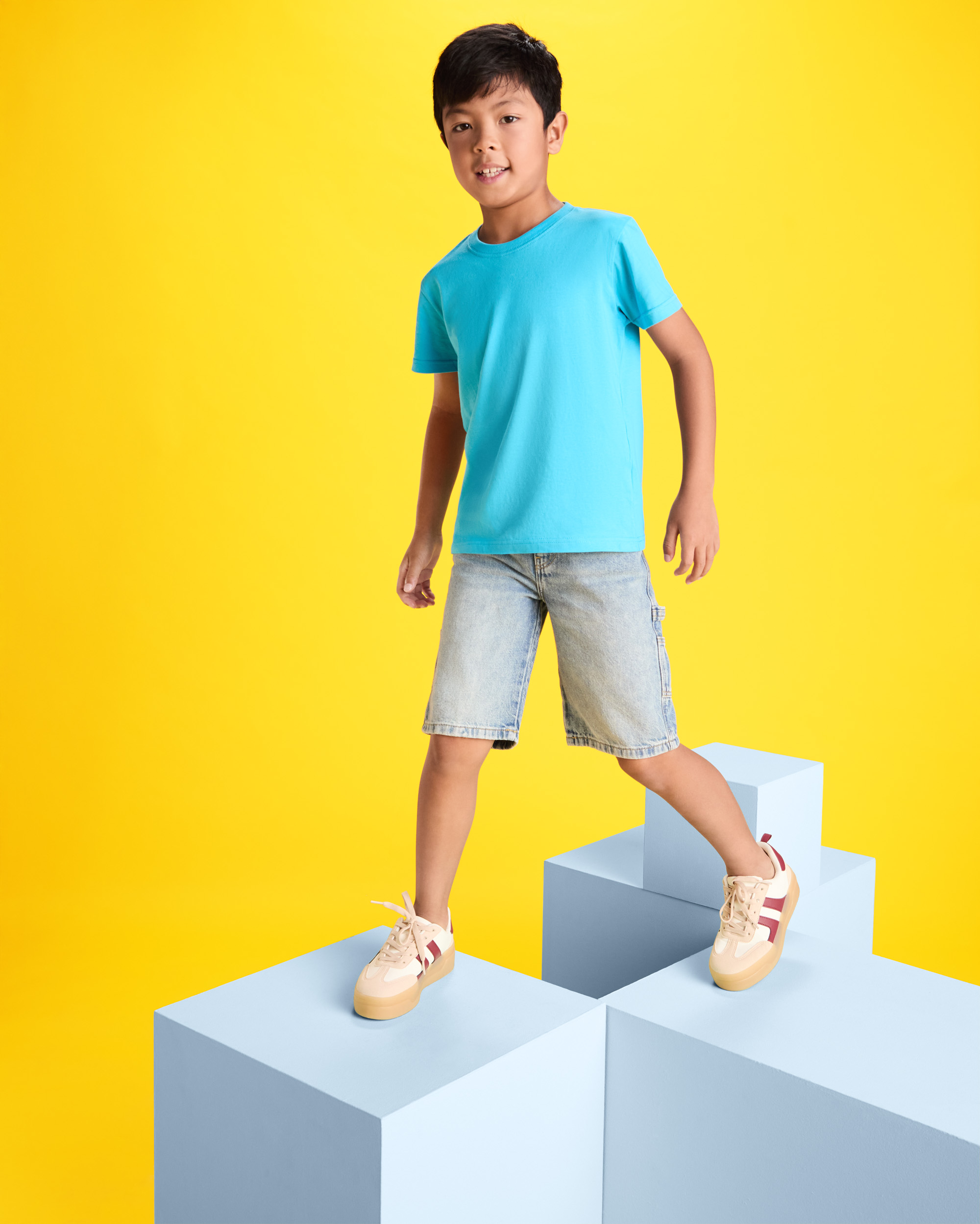 Camiseta de manga corta con costuras laterales. Algodón peinado. Cuello redondo en canalé 1×1 (4 capas). Cubrecosturas en cuello del mismo tejido.