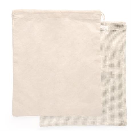 Bolsa multiusos ideal para la compra, de línea eco 100% algodón en color natural. Un lado de la bolsa en algodón suave y otro lado en ligera rejilla. Cierre de cordón y ajustador de plástico transparente.