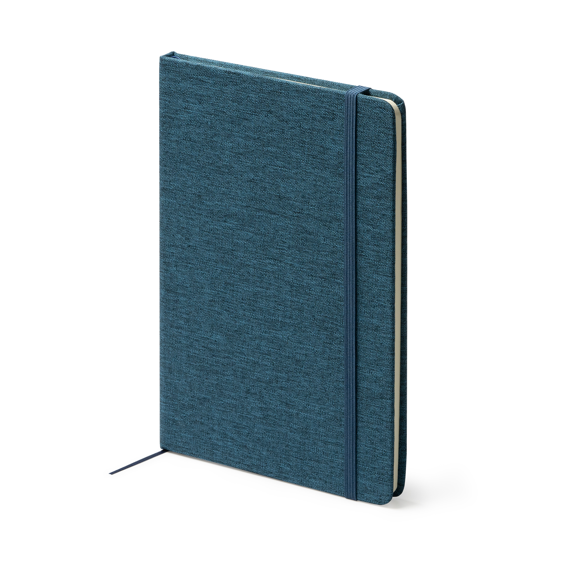 Bloc de notas A5 con tapa rígida de RPET. Marcapáginas y banda elástica a juego.